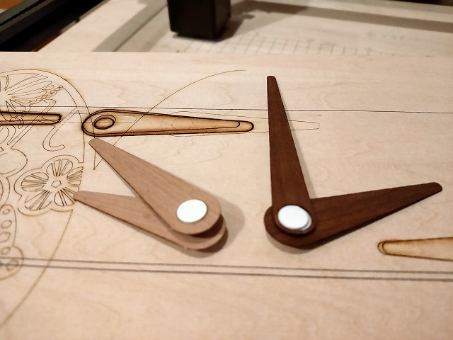 10月4日 (日) レーザーカッター そんなに期待はしていなかったレーザーカッターだが、以外に使える。 まずは、新作の時計にチャレンジしてみた。 30×30cmの文字盤の刻印と針の切り抜き。 針の切り抜きは、低出力の機械なので苦戦すると 思いきや、あっさり、綺麗に抜け、一発で商品化の目途がついた。 後は売れるかどうかや? |