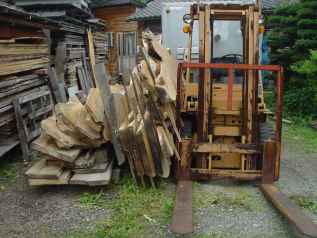 6月9日 (水) おークワバラ 夕暮れの時に積んである材木の上の板を取った。そしたら積んである材木が自分に向かってゆっくり倒れてきた。薄暗い夕暮れ、自分に向かってゆっくりなので最初倒れてきているのか解らなかった。(ゆっくりと言ってもその間2秒くらいだ) ヤバイとおもって反射的に横に飛んだ。一枚板の桜の木は見事にフォークリフトに倒れこんだ。間に挟まっていたらアバラの数本は折れてたか死んでたかもしれない。「おークワバラ クワバラ」 |