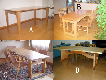 地震における死亡原因のトップに圧死があげられています。悲しい事に婚礼箪笥や食器棚など、家具は凶器に変わります。しかしテーブルや机など、身を守ってくれるのも家具です。 右の写真はうちで製作したダイニングテーブルの一例です。Aのようにシンプルな4つ脚やDの様な板脚などデザインは様々です。では天板の厚みや材種が同じと仮定して、どれが地震における落下物に対して強いでしょう? それはDもしくはBといえます |