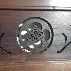 | 家紋も既存品を流用するか、新規に製作するかお客様は悩まれましたが、最終的に新規での製作となりました。既存品の切抜き加工と違い、今回は手彫りの家紋で、たいへん重厚になりました。 | |