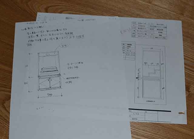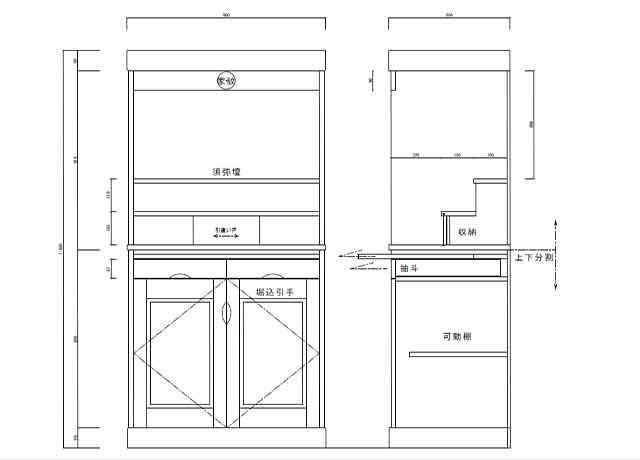 | 後にメールでのやりとりに移行し、お客様からFAXで頂いた原案をもとに、何回かの変更を経て、最終図面となりました。変更点は、抽斗二杯の追加と、須弥壇に引違い戸を付け内部に収納部を設けました。 | |