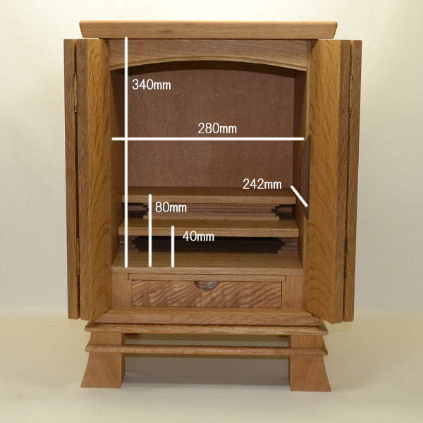 | ◆コンパクトな中に抽斗や祭壇トレーなど組み込んでおります。須弥壇もアレンジが自由に出来ますのでお祀りするご本尊に合わせてご利用頂けます。 |