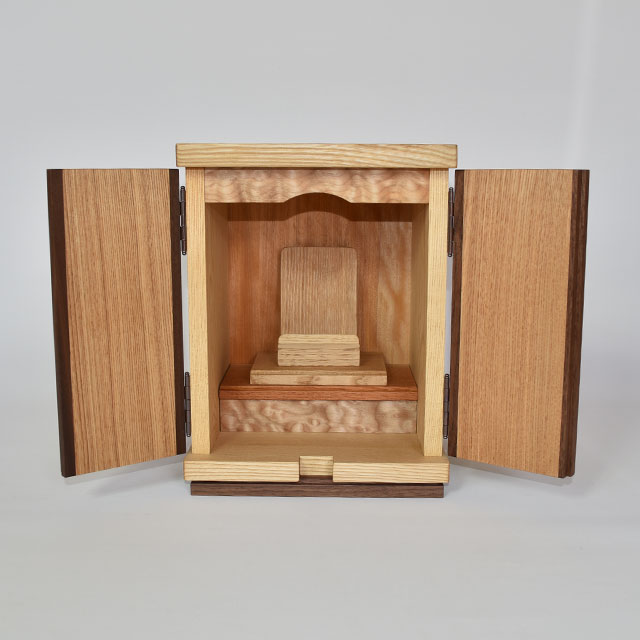 浄土真宗では位牌ではなく故人の法名(戒名)や命日を記録した「過去帳」を見台(けんだい)に載せ、仏壇の内部(中段や下段)に祀ります。過去帳のサイズから逆算してデザインしたコンパクトなミニ仏壇です。