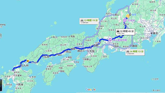 | とは言えショップからお客様のご自宅まで1041kmです。グーグル先生によるとノンストップで12時間45分です。 アホで無い限り最低でも神戸辺りで1泊程度が基本でしょうが、アホの初老人は無謀にも車で仮眠を取りながら福岡を目指す事にしました。 何度も言いますが1041kmは半端でありません、店長も同乗しますが高速の運転はしません。運転は実質初老人一人です。 以前も屋久島にソファーベンチを届けましたが、それに比べれば少しは近いですが体力が持つか心配です。 |