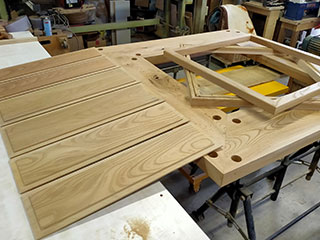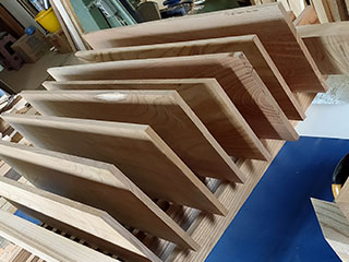 さて、時間をかけて乾燥した部材の加工に入ります。部材の加工だけでも数日かかりますが、木工家にとって厄介なのがせっかく平面や直線出しをしたのに、組み立てる前に部材が反ったり曲がったりする事です。1日の仕事終わりには部材の両面に空気が当たる様に立て掛けて帰ります。両面を同じ環境にすることで反りや曲りを極力減らすことが出来ます。