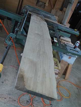 長さ240cm幅36cm厚み4,5cmの一枚板を惜しみなく使います。栗材は大木になればなるほどウロが入りやすく、鉄砲虫やカミキリ虫、キクイ虫も入ります。たぶん美味しいんでしょうね?