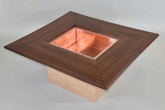 | ▲メープル枠の蓋はトレーとして使えます。炉は1mm厚の非常に純度の高いタフピッチ銅(C1100)です。 | |
