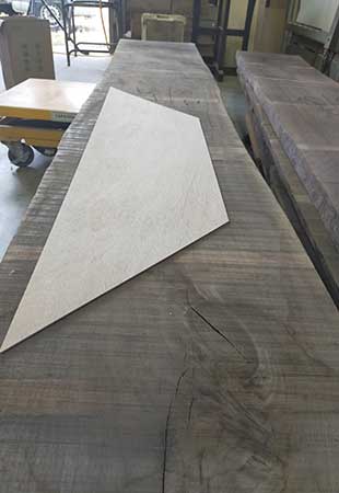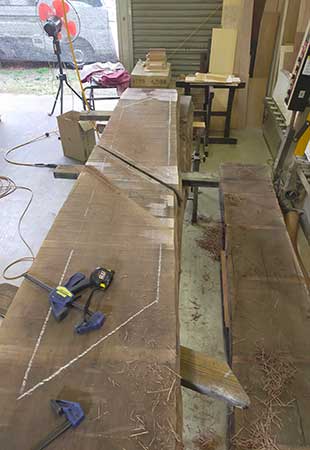 | ◆お客様よりメールでご注文頂いたブラックウォールナットの囲炉裏です。センターテーブル的にご使用の様です。 110cm×120cm角の天板を取る為に、長さ240cm×幅40cm程の板4枚を使います。べニア板が原寸の型となります。節・割れなどの欠点を避け良い部分のみを使用しますので4枚程の長尺材が天板の材料となります。マグロで言えば大トロ部分でしょうか。 | |