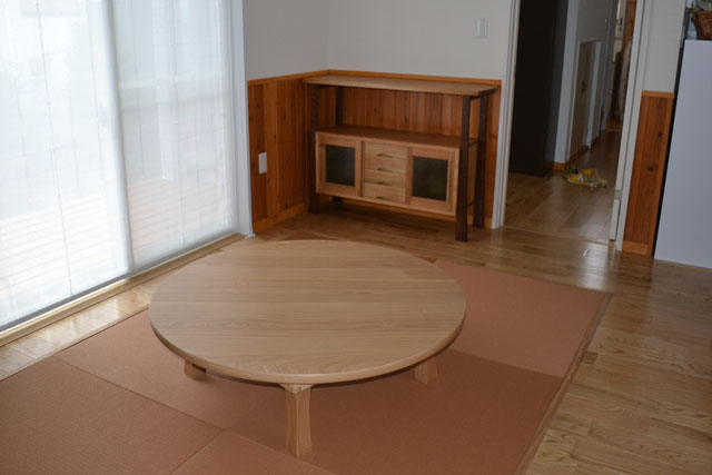 | ↑お買い上げいただいたお客様のお宅。納品して驚いたのですが、採寸して製作したわけではないのに、高さと幅が腰壁の中にピッタリ納まりました。びっくりでした。ちなみに手前のちゃぶ台はご注文頂きオーダーサイズで製作いたしました。 |