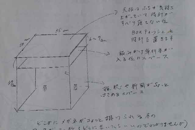 | ◆この品はFAXとお電話で数回の打合せをし、3度図面を修正して形となりました。巷にある安価なサイドテーブルとは違い、用途に合った、拘りのあるオーダー無垢家具に仕上がりました。 |