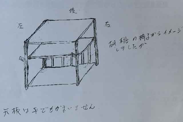 | ▲両側が板の様に見えたお客様から頂いた二枚目のFAX、どうやら角脚希望だったようで、修正されたFAXを頂き書き直した三枚目の図面です。小さなオーダー品ですが、間違いの無い様に何度も打合せを重ねて完成しました。用途に合わせ注文製作になりますのでお問い合わせください。 |